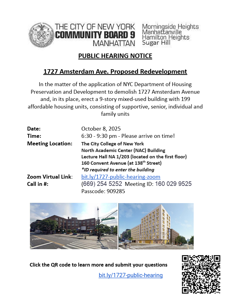 The first step in the ULURP process. Participate in person, virtually, or submit statement. If you live in Hamilton Heights-West Harlem, you have a stake in how the neighborhood you call home should be developed for this generation and next.
