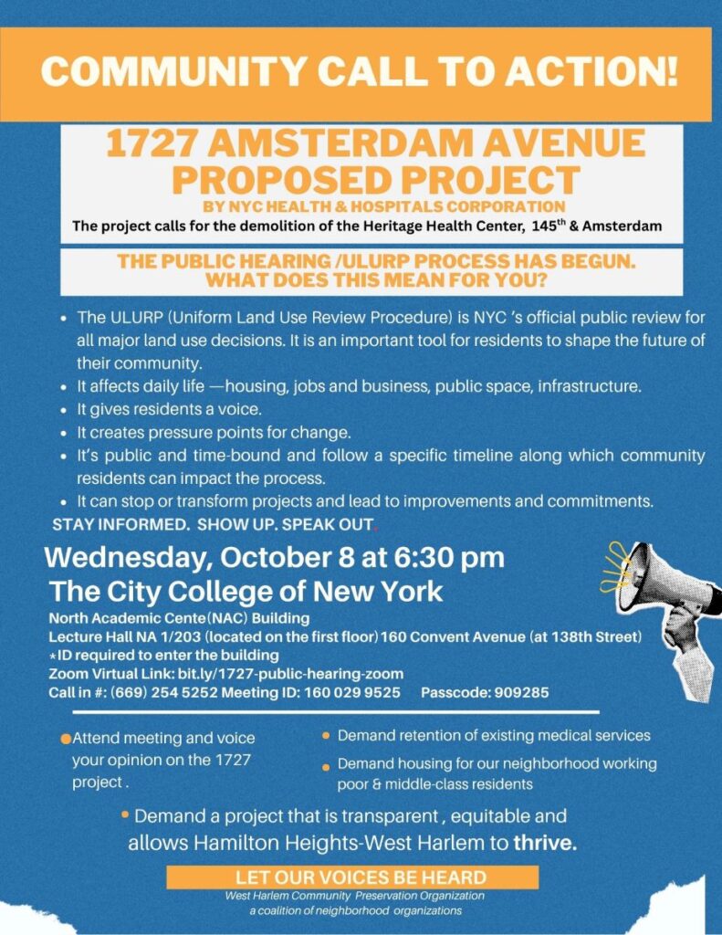 Make Your Voice Heard: ULURP Hearing on 1727 Amsterdam AvenueToday marks the first step in the ULURP (Uniform Land Use Review Procedure) for the 1727 Amsterdam Avenue project — and your voice matters. This is our community’s opportunity to share input, express concerns, and shape what happens on this site.Some may feel that “it’s already a done deal,” but it is not. In fact, it is because of your advocacy that this project is now subject to public review through ULURP. Your participation — whether by attending the hearing, joining via Zoom, or submitting written testimony — ensures that decision-makers hear from the people who live, work, and invest in this community every day.When & Where: